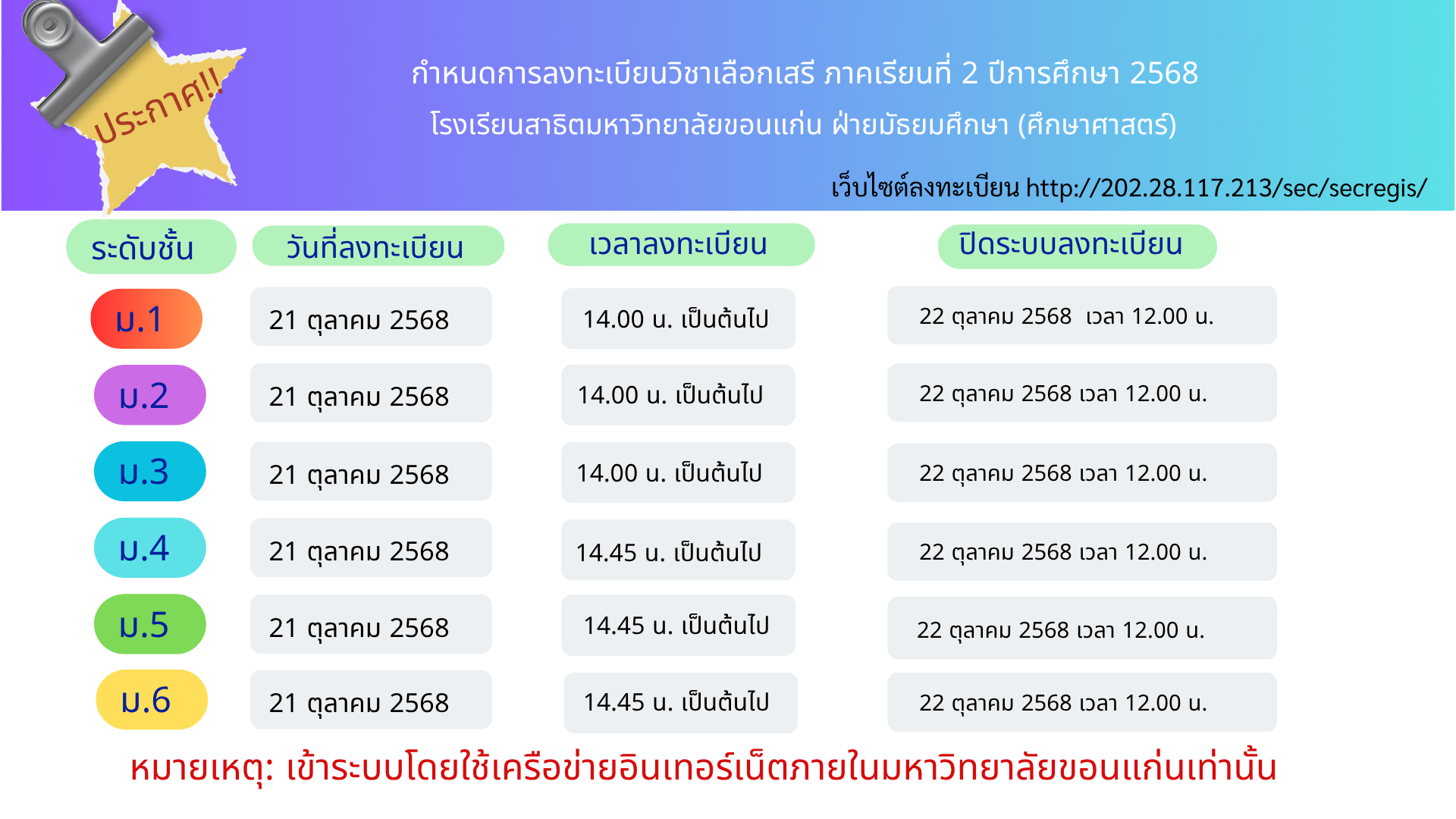กำหนดการลงทะเบียนวิชาเลือกเสรี ภาคเรียนที่ 2 ปีการศึกษา 2568